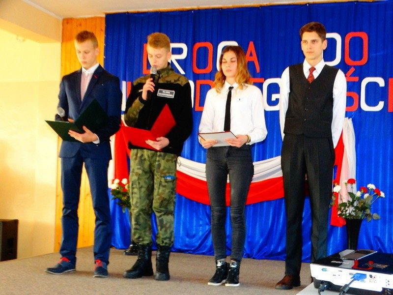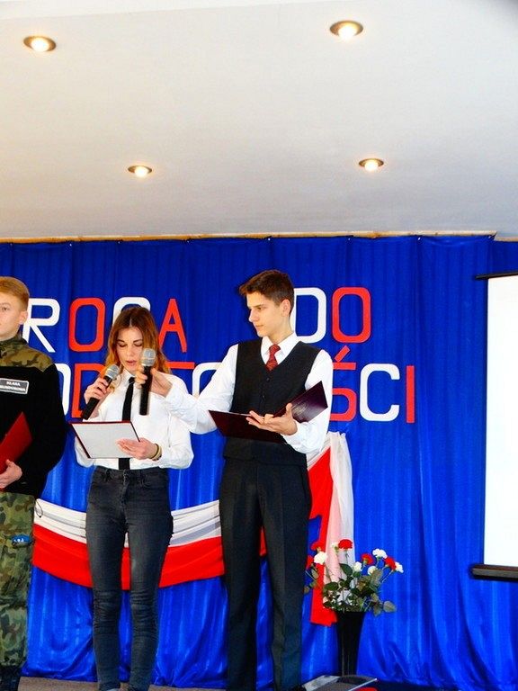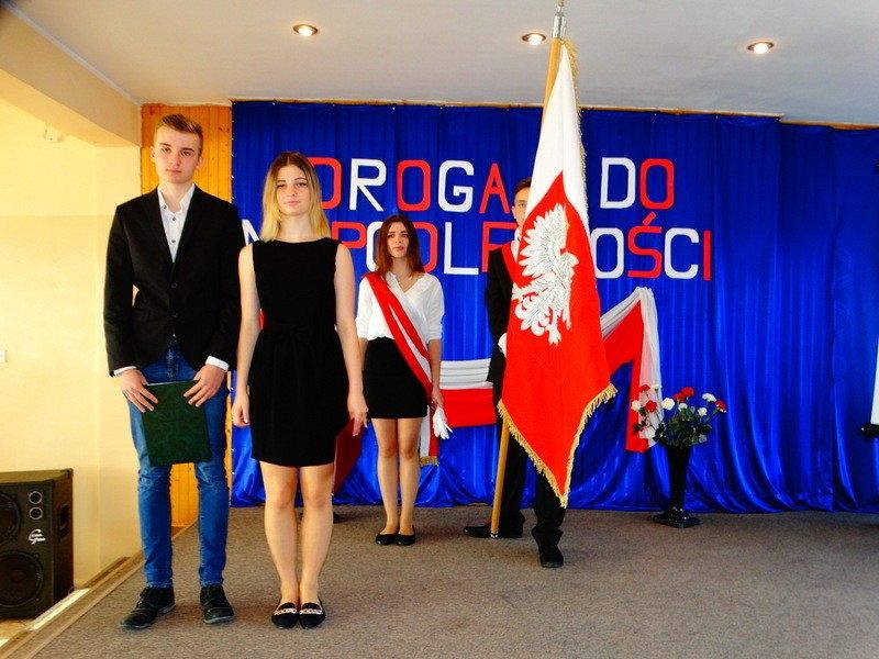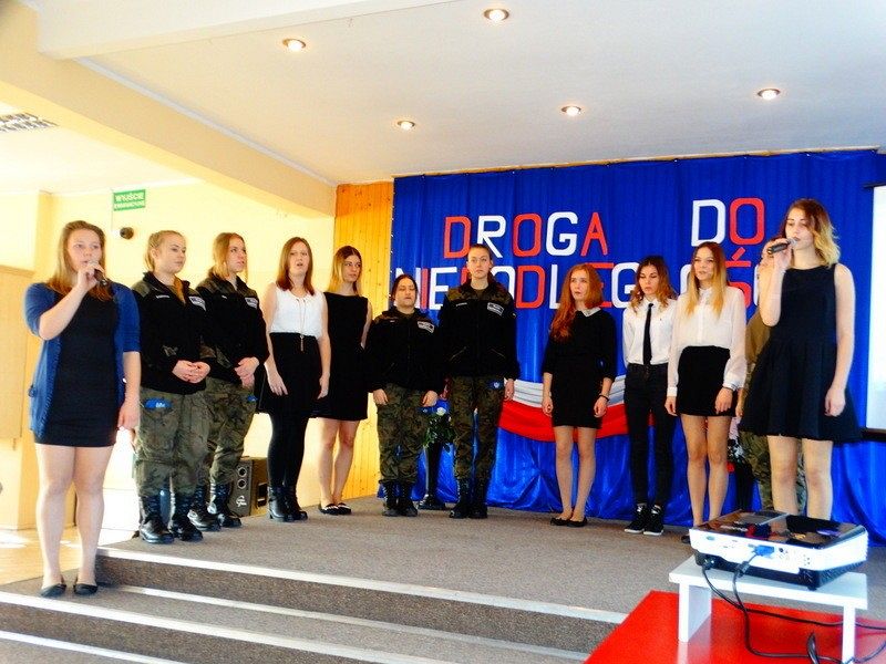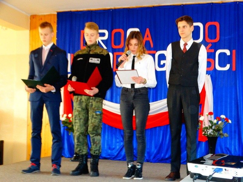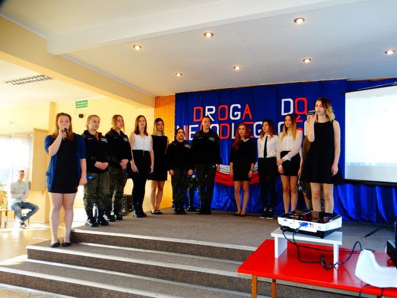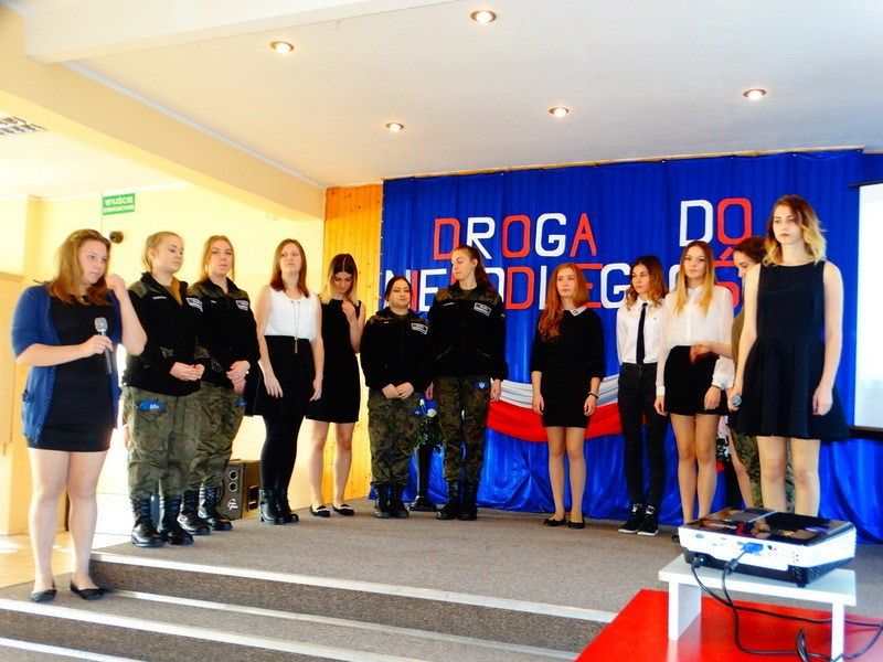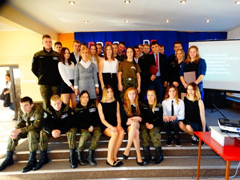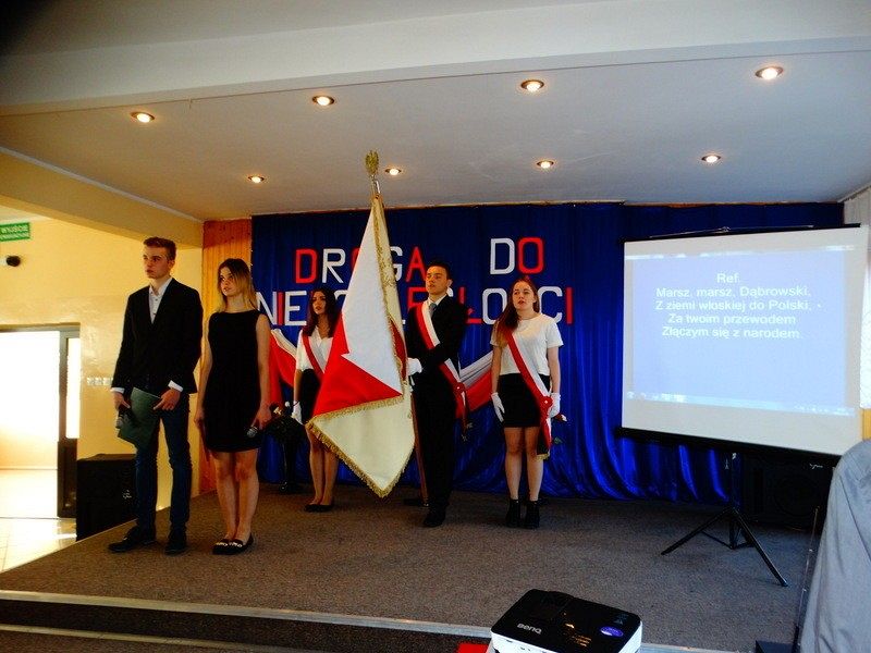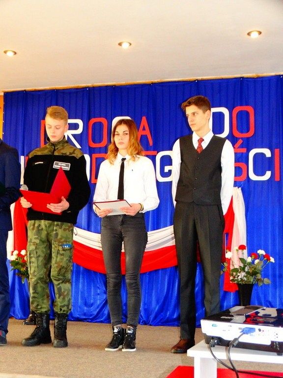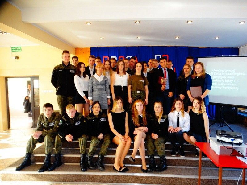Dnia 10.11.2016 r klasa IT pod kierunkiem Wiesławy Zarzyckiej przygotowała uroczysty apel z okazji Dnia Niepodległości. Tematem przewodnim przygotowanej prezentacji multimedialnej była DROGA DO WOLNOSCI. Obserwatorami apelu byli głównie uczniowie wszystkich klas pierwszych. Apel rozpoczął się odśpiewaniem wszystkich czterech zwrotek hymnu państwowego, były wiersze i piosenki :Wojenko, wojenko..." oraz "Rozkwitały pąki białych róż" w wykonaniu utalentowanych uczennic tej klasy, ze szczególnym uwzględnieniem takich uczennic jak Karolina Wrońska oraz Angelika Zakrzewska. Podkład muzyczny stanowiła etiuda e-moll op.72 Chopina .Apel przygotowano z wykorzystaniem materiałów bibliotecznych oraz zasobów internetowych.Dekorację wykonali uczniowie: Anna Reszka oraz Marcin Gruba a także Daria Heft,za sprzęt odpowiedzialny był Kacper Kępa ,którego wspomagali uczeniowie starszej klasy Maksymilian Lawrenc i Michał Jabłoński.
