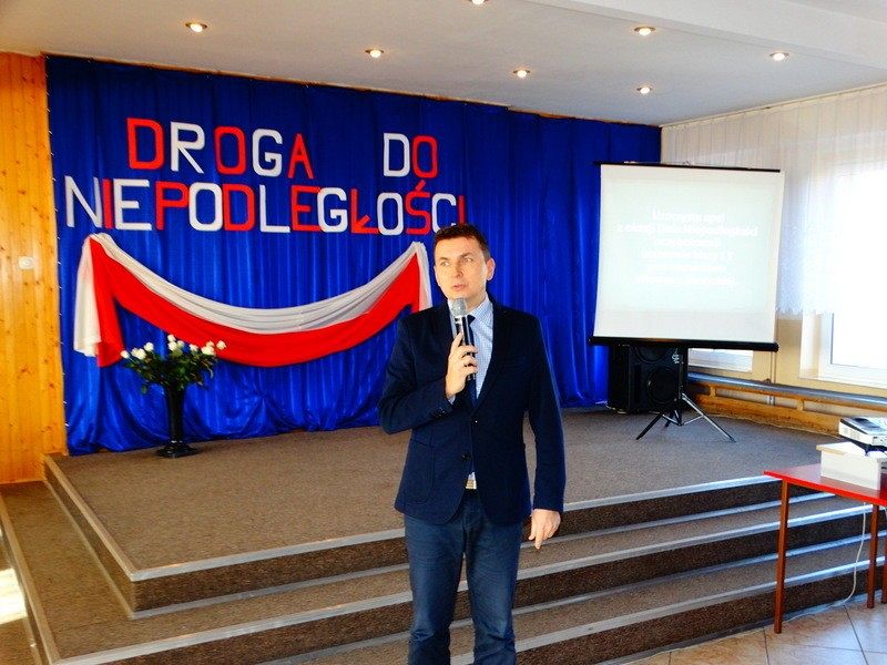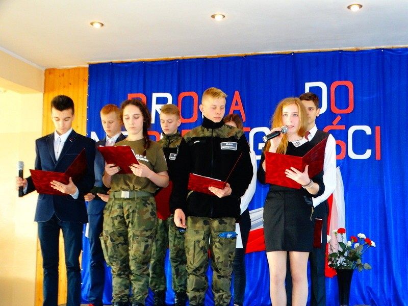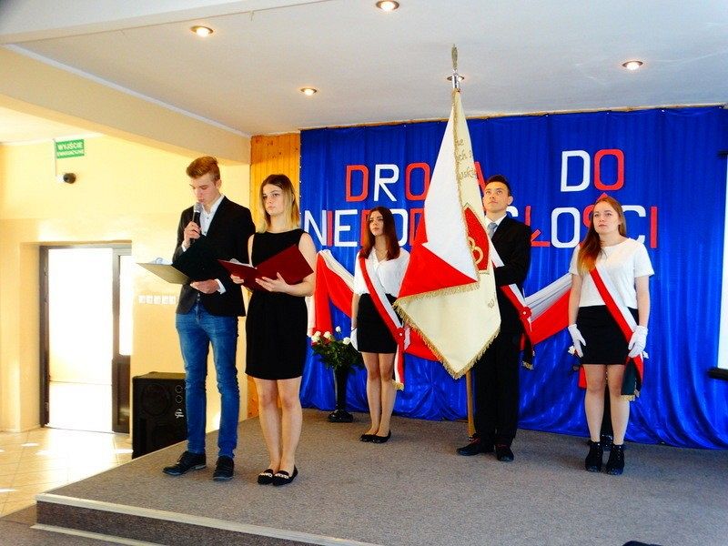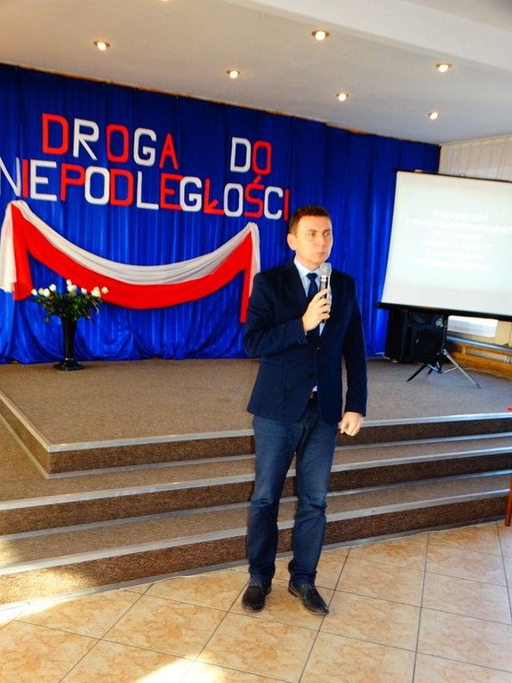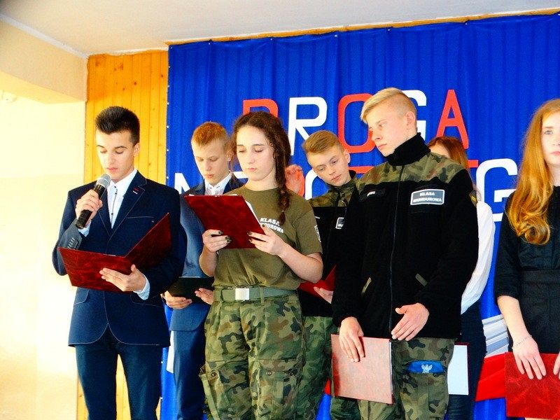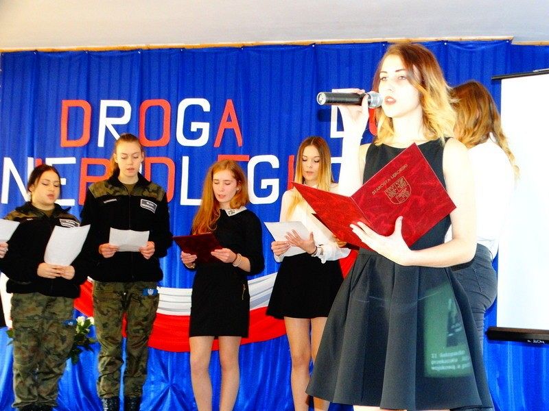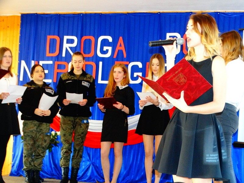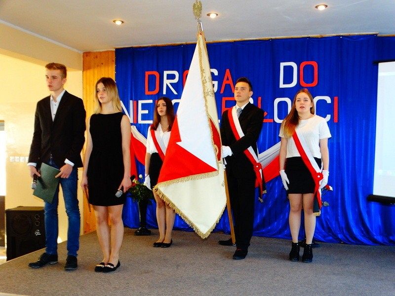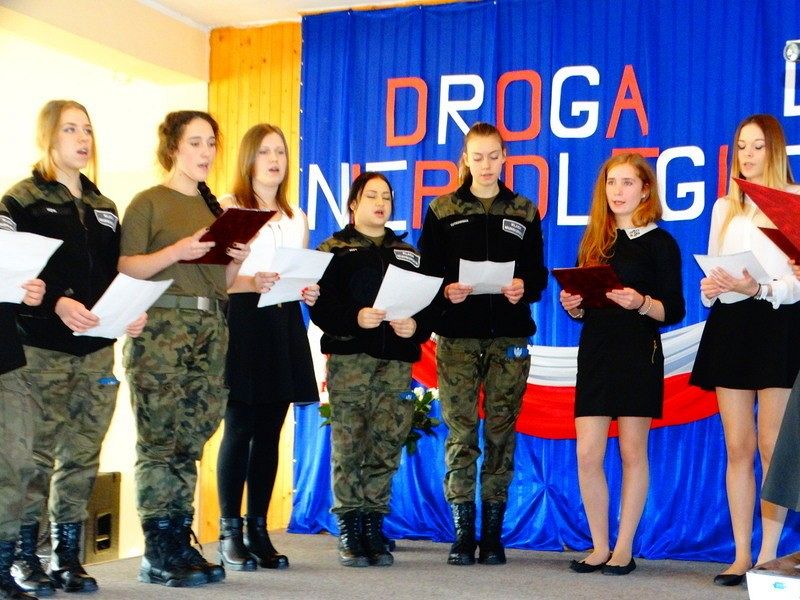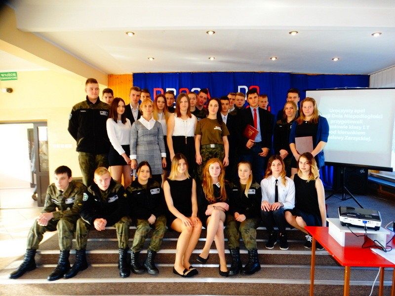 Dnia 10.11.2016 r klasa IT pod kierunkiem Wiesławy Zarzyckiej przygotowała uroczysty apel z okazji Dnia Niepodległości. Tematem przewodnim przygotowanej prezentacji multimedialnej była DROGA DO WOLNOSCI. Obserwatorami apelu byli głównie uczniowie wszystkich klas pierwszych. Apel rozpoczął się odśpiewaniem wszystkich czterech zwrotek hymnu państwowego, były wiersze i piosenki :Wojenko, wojenko..." oraz "Rozkwitały pąki białych róż" w wykonaniu utalentowanych uczennic tej klasy, ze szczególnym uwzględnieniem takich uczennic jak Karolina Wrońska oraz Angelika Zakrzewska. Podkład muzyczny stanowiła etiuda e-moll op.72 Chopina .Apel przygotowano z wykorzystaniem materiałów bibliotecznych oraz zasobów internetowych.Dekorację wykonali uczniowie: Anna Reszka oraz Marcin Gruba a także Daria Heft,za sprzęt odpowiedzialny był Kacper Kępa ,którego wspomagali uczeniowie starszej klasy Maksymilian Lawrenc i Michał Jabłoński.