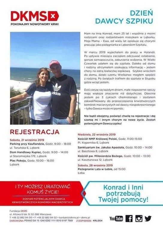 Nasza szkoła włączyła się w miejską akcję poszukiwania Dawców szpiku organizowaną przez Fundację DKMS. Konrad Repp, młody mieszkaniec Lęborka, jest chory na ostrą białaczkę szpikową. Odbył już 3 cykle chemioterapii i tylko Dawca może uratować mu ŻYCIE. Rejestracja potencjalnych dawców będzie odbywać się 21. 09. 2019 ( sobota) w trzech miejscach na terenie naszego miasta:
