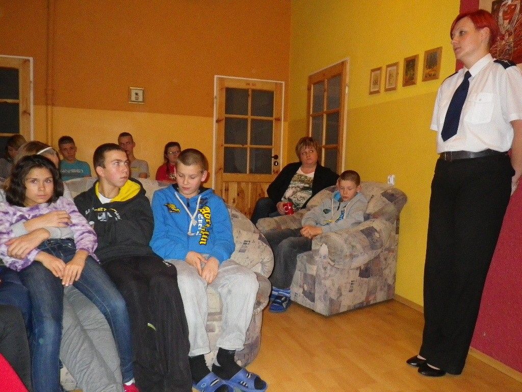 W jasny i zwięzły sposób pani aspirant zapoznała dzieci i młodzież z zasadami i zadaniami poprawnego korzystania z pasów bezpieczeństwa w samochodzie oraz prawidłowego przechodzenia przez jezdnię. Następnie omówiła problem palenia papierosów, spożycia alkoholu oraz środków psychoaktywnych przez nieletnich.