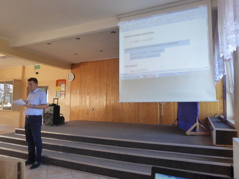 W czwartek 09.09.2021 r. w szkolnej świetlicy Dyrekcja Szkoły przeprowadziła spotkanie informacyjne dla rodziców uczniów klas maturalnych: IVTla i IVT. Został przedstawiony harmonogram organizacji roku szkolnego 2021/2022 z uwzględnieniem m.in. planowanych dodatkowych wspomagających zajęć pozalekcyjnych dla maturzystów. Rodzice poznali również terminarz egzaminów zawodowych oraz matury, ich specyfikę, a także warunki przystępowania do tych form sprawdzenia wiedzy i umiejętności czwartoklasistów.