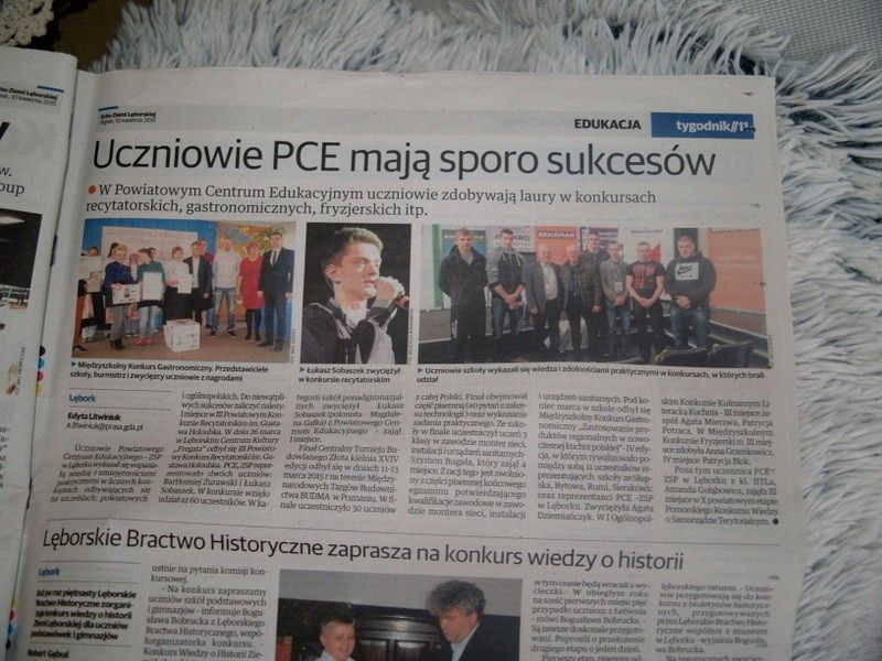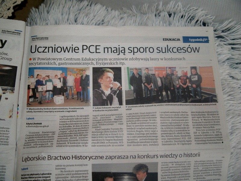 - informujemy, że 10 kwietnia 2015 roku, w „Echu Ziemi Lęborskiej”- ukazał się artykuł dotyczący sukcesów uczniów –Powiatowego Centrum Edukacyjnego- ZSP w Lęborku. Zachęcamy więc do lektury, która podkreśla, że warto jest zdobywać wiedzę w szkole ponadgimnazjalnej, a także brać udział w licznych konkursach na szczeblach szkolnych, powiatowych i ogólnopolskich.