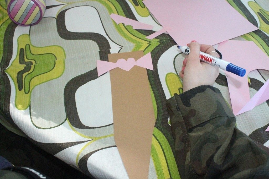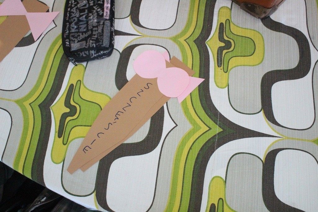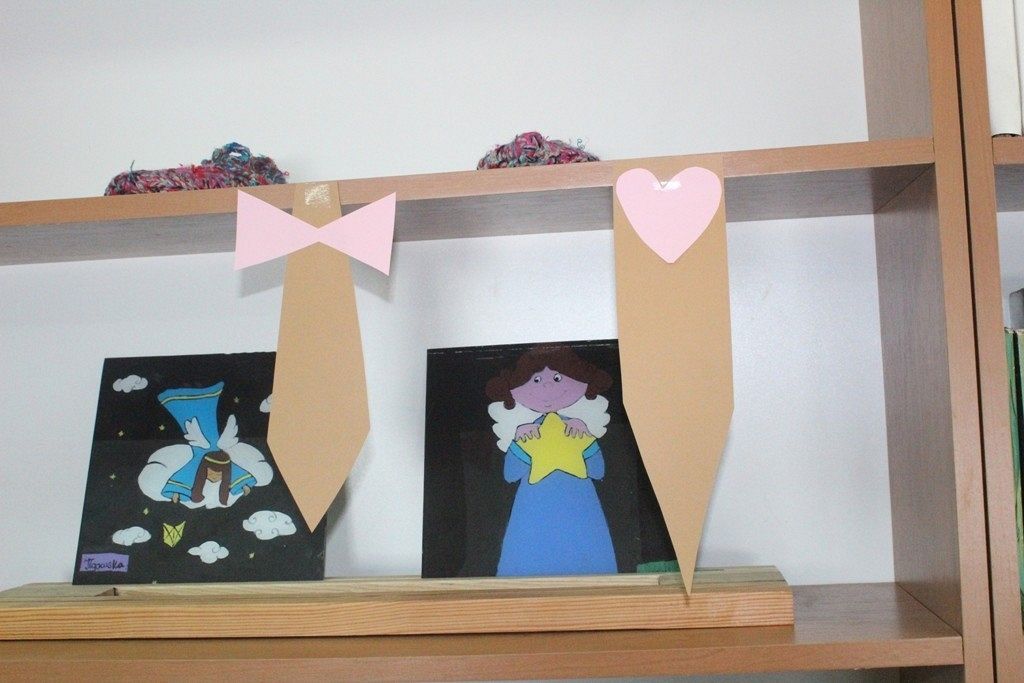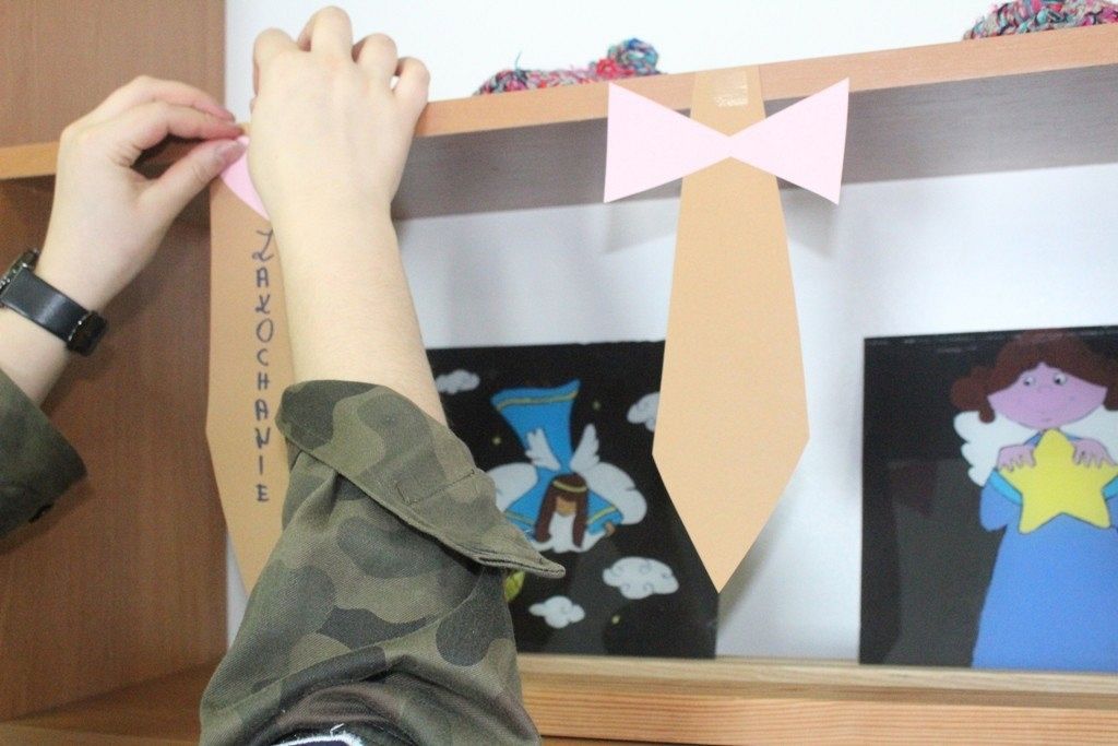 W dalszej części warsztatów przypinamy nasze krawaty do drewnianych regałów tworząc w ten sposób wachlarz modnych propozycji dla płci – przeciwnej od tej pięknej.