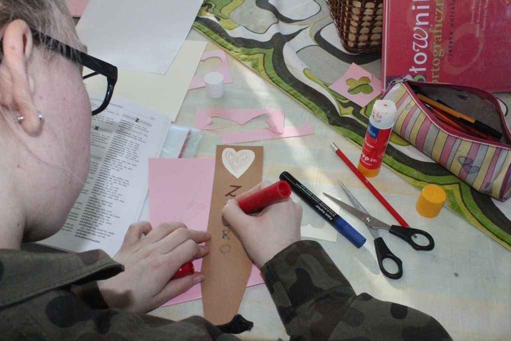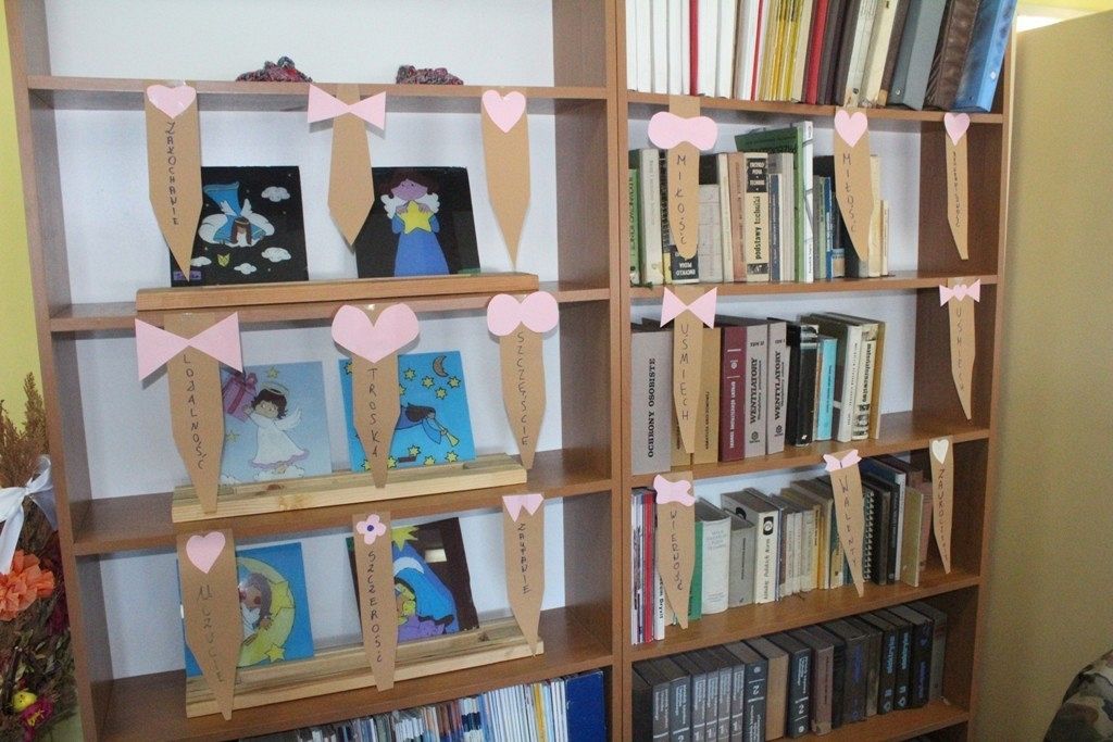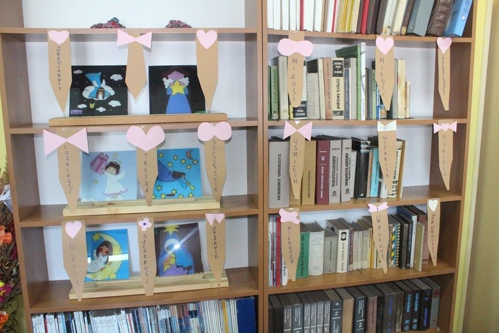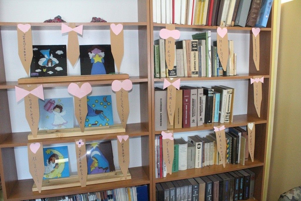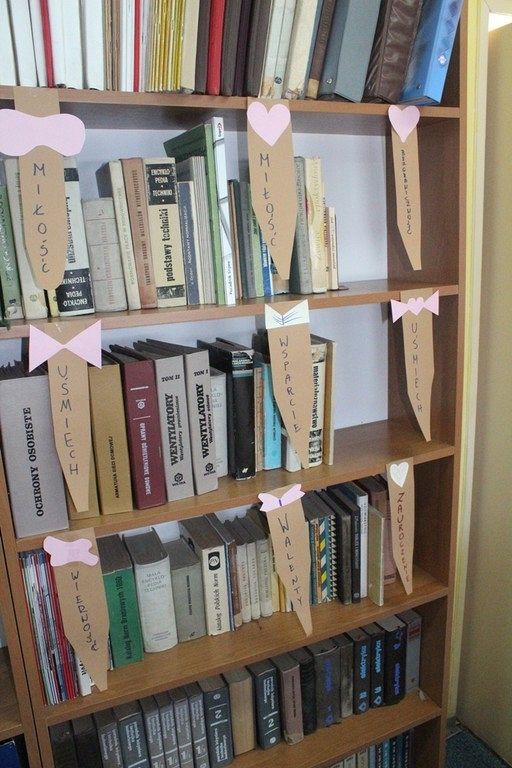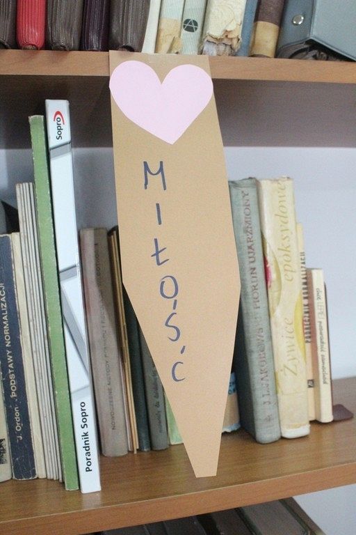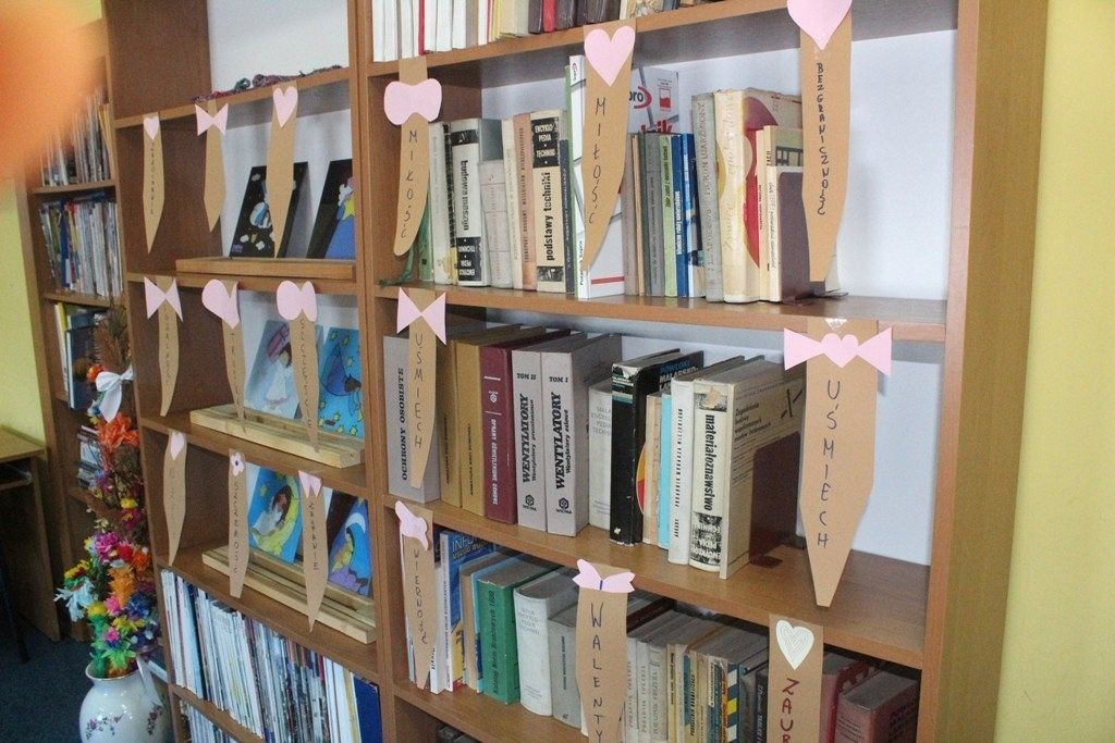 Walentynki dla mężczyzn oznaczają - w naszej szkolnej bibliotece - przygotowanie zakładek książkowych w formie męskich krawatów. Przyozdabiamy je więc kobiecymi serduszkami, które w różowych kolorach przypominają typowo niewinne, dziecięce, uczucia. Forma wykorzystania woluminów odciska swój ślad w wybranym synonimie dotyczącym tegorocznych Walentynek, który uczniowie z klasy 3TLB zapisują na papierze.