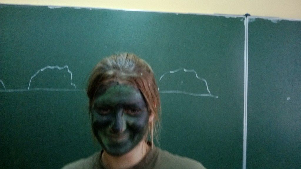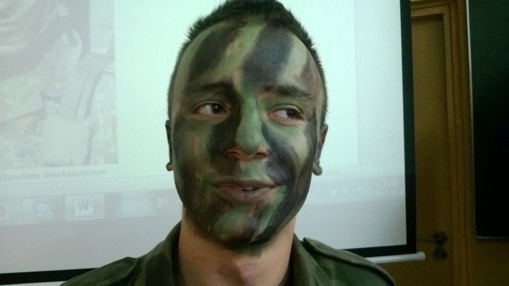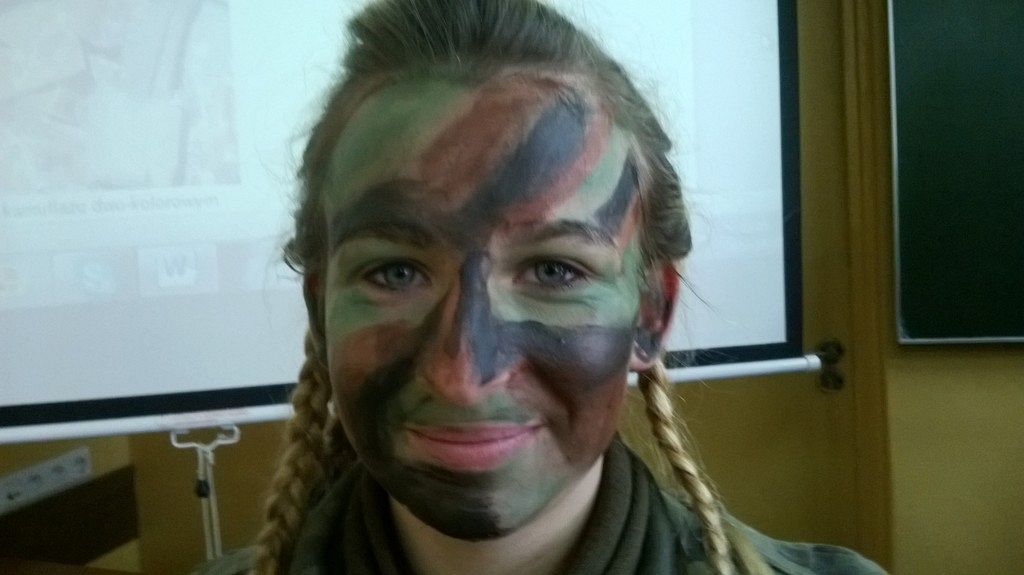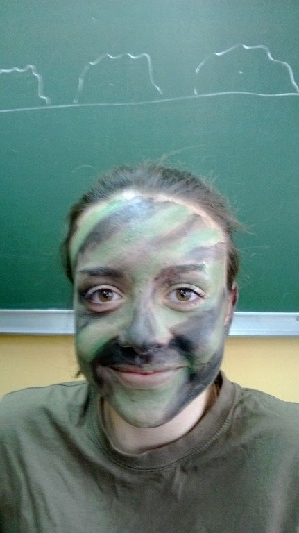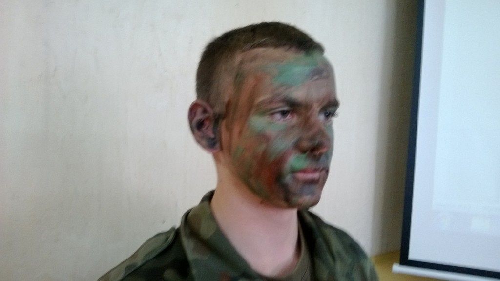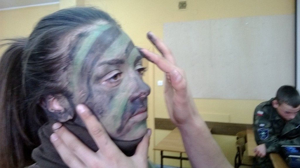 W czasie kolejnych zajęć z przedmiotu edukacja wojskowa uczniowie klas drugich wojskowych w PCE zagłębiali tajniki maskowania i kamuflażu. Jednym z zagadnień, które realizowali była sztuka wykonania malowania twarzy specjalnymi farbami do ciała, tak aby była ona, jak najmniej widoczna w różnym otoczeniu. Jak widać na zdjęciach efekty takich zajęć były imponujące, a jedną z koleżanek trudno było zauważyć na tle tablicy. Uczniowie nazwali to wykonanie maskowania tzw. - „kamuflażem szkolnym” - czyli najlepszym, który mogą przybrać w czasie odpowiedzi przy tablicy.